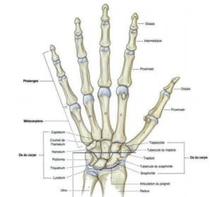 Anatomiquement, la main se subdivise en trois régions : le poignet (carpe), la paume constituée des cinq métacarpiens et les doigts composés des phalanges. On peut également distinguer le carpe d’une part et les doigts (métacarpiens et phalanges) d’autre part.