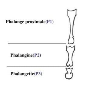 Les phalanges prolongent les métacarpiens et se présentent comme des os longs et symétriques. Chaque doigt comporte trois phalanges (proximal, moyen, distal), sauf le pouce qui n’en a que deux. Chaque phalange possède une base (épiphyse proximale), une diaphyse et une tête (épiphyse distale). On distingue : la phalange proximale (P1), la phalangine (P2) et la phalangette (P3). La base de P3 fusionne pratiquement avec sa tête, et chaque phalange terminale se termine par une tubérosité en fer à cheval appelée houppe phalangienne.