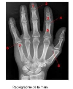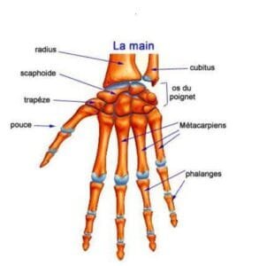 Anatomiquement, la main se subdivise en trois régions : le poignet (carpe), la paume constituée des cinq métacarpiens et les doigts composés des phalanges. On peut également distinguer le carpe d’une part et les doigts (métacarpiens et phalanges) d’autre part.