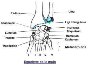 Rangée proximale (de dehors en dedans) : scaphoïde, lunatum, triquetrum et pisiforme.