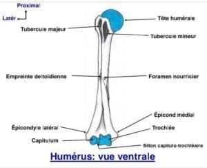 L’extrémité proximale présente trois saillies : la tête humérale (saillie médiale et articulaire) et deux saillies non articulaires, les tubercules majeur et mineur.