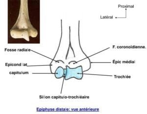 Fosse coronoïdienne : elle se situe au-dessus de la trochlée sur la face antérieure et reçoit le bec du processus coronoïde de l’ulna lors des mouvements de flexion de l’avant‑bras.