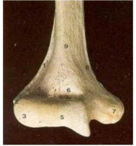 Épicondyle médial (épitrochlée) : très saillant et aplati d’avant en arrière, il donne insertion aux muscles épicondylaires médiaux et présente une gouttière à sa face supérieure pour le nerf ulnaire, dont la protection doit être prise en compte lors d’une immobilisation plâtrée.