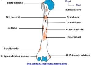 De nombreux muscles s’attachent sur l’humérus, notamment le subscapulaire, le grand rond, le grand dorsal, le brachial antérieur, les muscles épicondylaires médiaux (sur l’épitrochlée), le coraco‑brachial, le supra‑épineux, le grand pectoral, le deltoïde et le brachio‑radial du côté ventral ; et, sur la face dorsale, le muscle infra‑épineux, le deltoïde, le brachial antérieur, l’extenseur ulnaire du carpe, l’anconé, le fléchisseur ulnaire, le vaste médial, le vaste latéral et le petit rond.