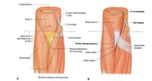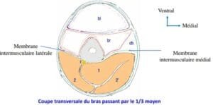 Le bras est divisé en deux loges par des cloisons intermusculaires (aponévroses) qui s’insèrent sur le bord médial et latéral de l’humérus.