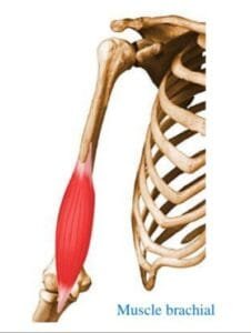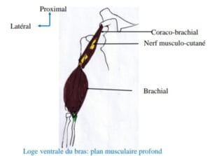 muscle aplati situé sous le coraco‑brachial, s’attachant au bord ventral et aux faces médiale et latérale de l’humérus ; il se termine sur le processus coronoïde de l’ulna. Innervé par le nerf musculo‑cutané, il est fléchisseur de l’avant‑bras.
