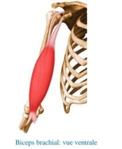 muscle à deux chefs (long et court). Le chef court s’insère sur la pointe du processus coracoïde, le chef long sur le tubercule supra‑glénoïdal de la scapula. Les deux chefs convergent en un tendon fixé sur la tubérosité radiale ; une expansion aponevrotique se détache vers l’aponévrose brachiale. Innervé par le nerf musculo‑cutané, il fléchit le coude.