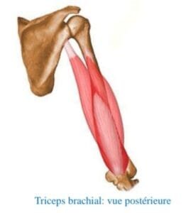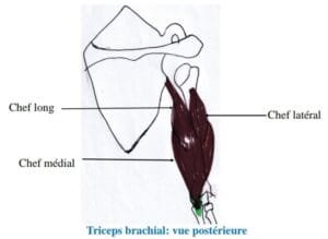 Elle est occupée par le triceps brachial, formé de trois chefs : chef long (tubercule infra‑glénoïdal), chef latéral et chef médial (faces dorsales de l’humérus). Les trois se réunissent pour former un tendon inséré sur l’olécrâne. Innervé par le nerf radial, il est l’extenseur puissant de l’avant‑bras.