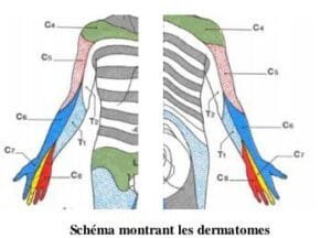 Les dermatomes suivent un ordre centrifuge : C5 (épaule et face latérale du bras), C6 (avant‑bras latéral et pouce), C7 (index et majeur), C8 (annulaire et auriculaire), T1 (face médiale de l’avant‑bras et du bras).