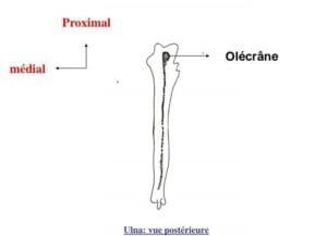 Olécrâne : processus vertical situé à l’arrière de la diaphyse. Sa face supérieure reçoit le tendon du triceps et se termine en avant par le bec de l’olécrâne.