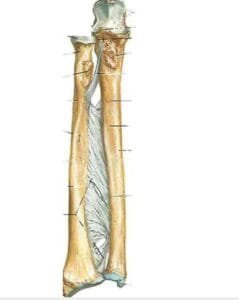Bord latéral : appelé crête interosseuse, il sert d’attache au ligament interosseux. Dans sa partie supérieure, deux crêtes délimitent une petite surface triangulaire pour le muscle supinateur et une facette articulaire, l’incisure radiale de l’ulna.