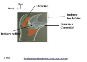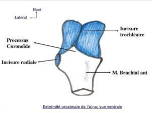 Processus coronoïde : processus horizontal et ventral en forme de pyramide triangulaire. Son apex constitue le bec du processus coronoïde; sa base est implantée sur la face ventrale de l’ulna. La face supérieure participe à l’incisure trochléaire, et la face inférieure, rugueuse, est le siège de l’insertion du brachial. La face médiale est le point d’attache du ligament collatéral ulnaire, tandis que la face latérale forme l’incisure radiale accueillant la tête radiale et présente le tubercule coronoïde pour le ligament de Weitbrecht.