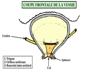 Le trigone vésical, zone triangulaire lisse située entre les deux orifices urétéraux reliés par le bourrelet inter-urétérique, et le col vésical à son sommet.