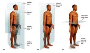 Trois plans, perpendiculaires (Plan frontal ou coronal; Plan sagittal; et Plan transversal ou horizontal ou axial), entre eux, structurent la description anatomique :