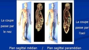 • Sagittal paramédian : parallèle au plan médian et divisant le corps en une partie interne et une partie externe.